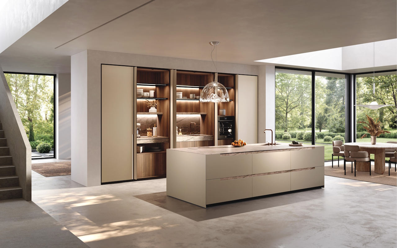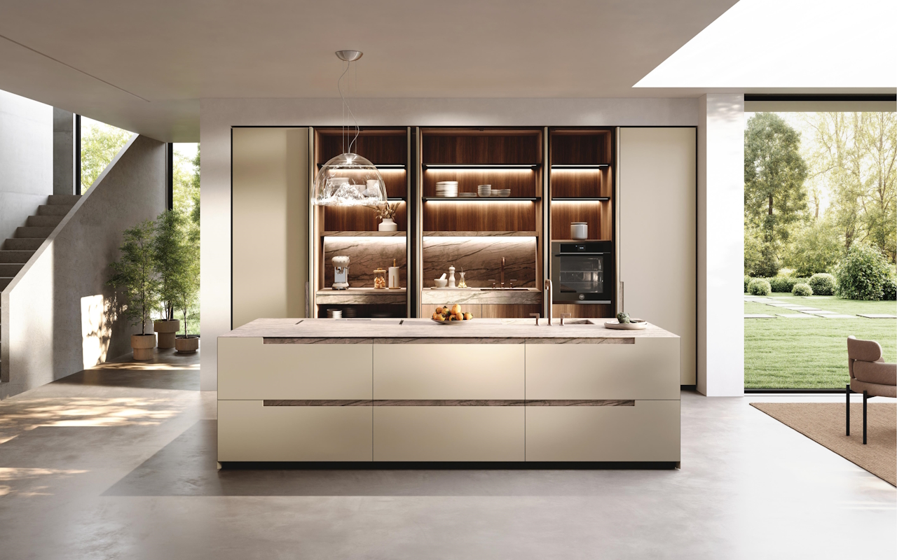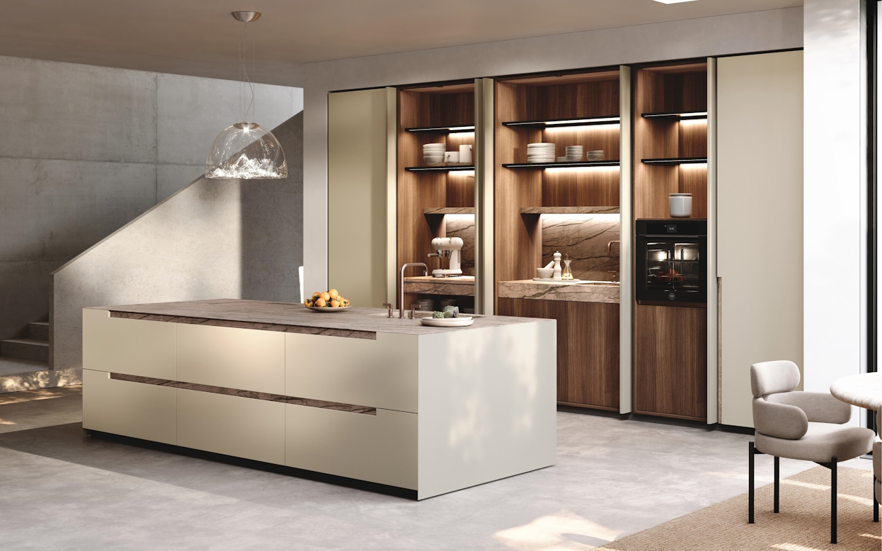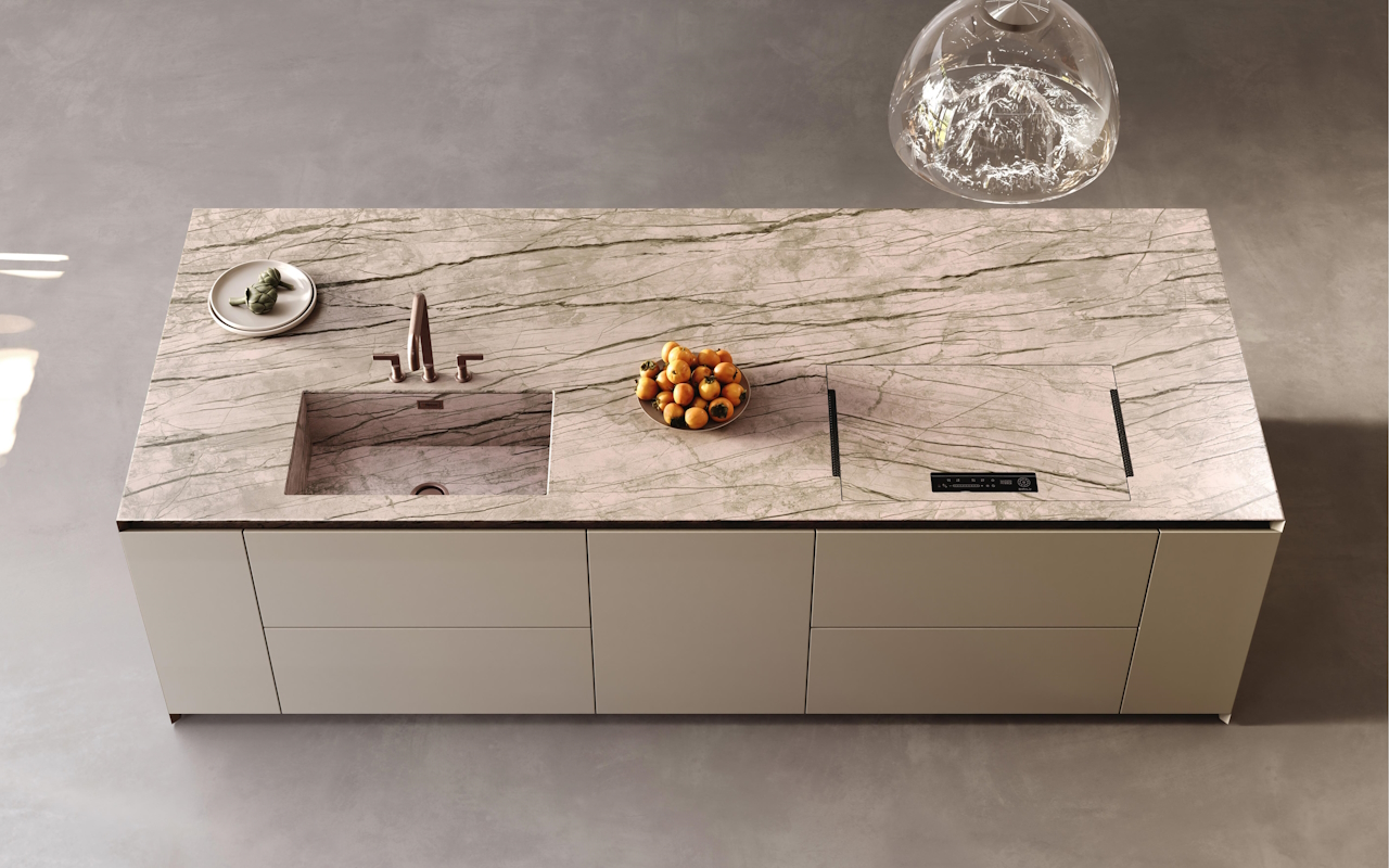 Η νησίδα Bluna είναι σαν ένας εκλεπτυσμένος μονολιθικός όγκος που κάνει ως κύριο χαρακτηριστικό της την αναζήτηση της απλότητας και των καθαρών γραμμών. Οι χαρακτηριστικές πέτρινες λαβές, σχεδιασμένες ως οριζόντια τμήματα που εισάγονται στην επάνω άκρη των προσόψεων, και η κομψή επιφάνεια εργασίας από πέτρα σε ματ ασημί Root, μετριάζει την αυστηρότητα και ωραιοποιεί την αισθητική καθαρότητα των επιφανειών. Όπως και στο θέατρο όταν σηκώνεται η αυλαία, τη στιγμή που ανοίγει το ντουλάπι τοίχου, ανοίγεται ένας ορίζοντας αποκαλύψεων που πολλαπλα-σιάζει χώρους και λειτουργίες. Οι κολώνες κρύβουν απροσδόκητες λύσεις, όπως πρακτικούς πάγκους εργασίας με δυνατότητα εξαγωγής, χώρους πλυσίματος και συσκευές. Απλώς κλείστε τις πόρτες για να αποκατασταθούν τα όρια της τάξης.
